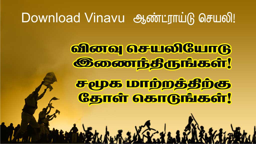 வினவு செயலியை அறிமுகம் செய்ய வேண்டுமென்று சில வருடங்களாகவே நினைத்திருந்தாலும் நடக்கவில்லை. இந்த ஆண்டு புதிய வடிவமைப்பு அறிமுகப்படுத்திய பிறகு சில பல தொழில் நுட்ப சிக்கல்களை சரி செய்த பிறகு தற்போது Vinavu ஆண்ட்ராய்டு செயலியை அறிமுகம் செய்கிறோம்.