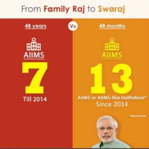 தாங்கள் ஆட்சிக்கு வரும் வரை இந்தியாவில் 7 எய்ம்ஸ் மருத்துவ மனைகள்தான் இருந்ததாகவும் 2014-ல் ஆட்சிக்கு வந்து 48 மாதங்களில் 13 அகில இந்திய மருத்துவ விஞ்ஞானக் கழக மருத்துவமனைகளை உருவாக்க ஒப்புதல் அளித்திருப்பதாகவும் மத்திய அரசு சொல்கிறது.