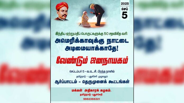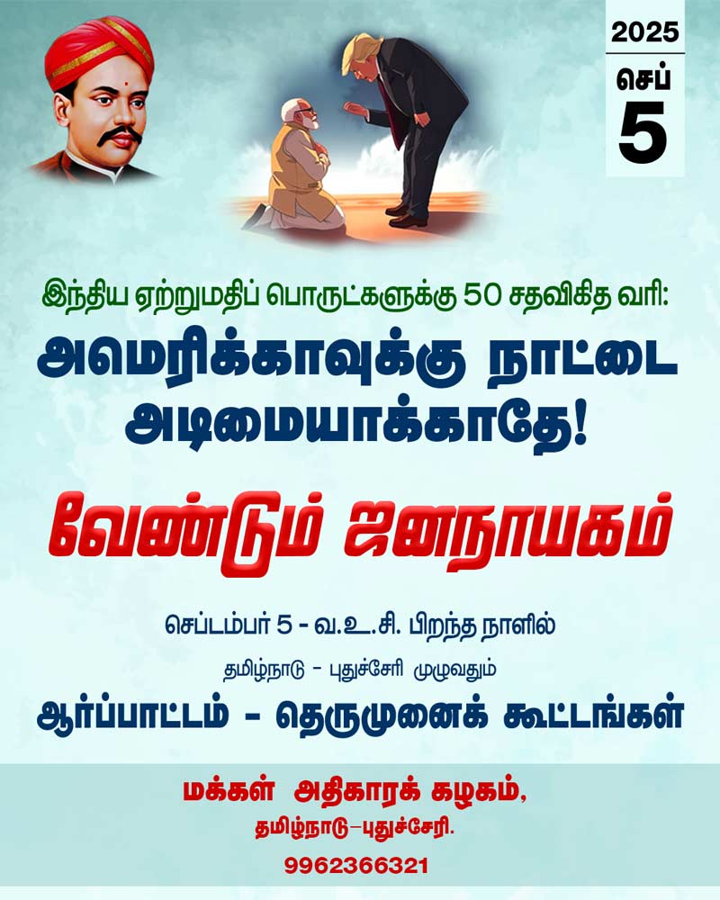உலக மேலாதிக்க பயங்கரவாதியும் பாசிஸ்டுமான அமெரிக்க அதிபர் டொனால்டு ட்ரம்ப் நமது நாட்டிலிருந்து ஏற்றுமதியாகும் பொருட்கள் மீது 50 சதவிகித வரி விதித்துள்ளார். ஆக்ஸ்ட் 7 முதல் 25 சதவிகித வரி அமலுக்கு வந்துள்ள நிலையில், ஆகஸ்ட் 27 முதல் கூடுதல் 25 சதவிகித வரி அமலப்படுத்தப்படும் என்று அறிவிக்கப்பட்டுள்ளது.