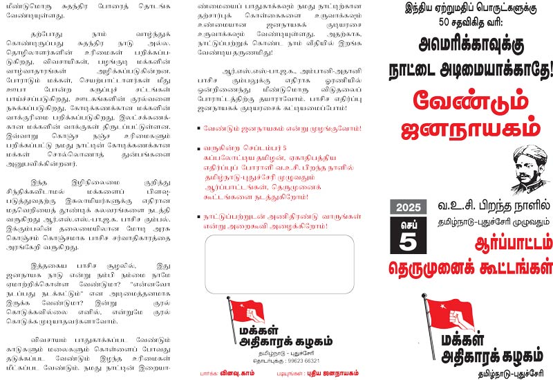 ஆர்.எஸ்.எஸ்-பா.ஜ.க., அம்பானி-அதானி பாசிச கும்பலுக்கு எதிராக ஓரணியில் ஒன்றிணைந்து மீண்டுமொரு விடுதலை போராட்டத்திற்கு தயாராவோம். பாசிச எதிர்ப்பு ஜனநாயகக் குடியரசைக் கட்டியமைப்போம்!