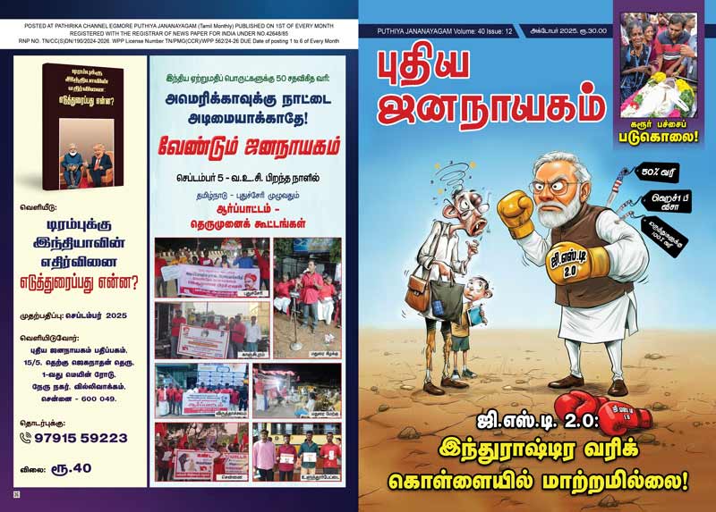 புதிய ஜனநாயகம் – ஆகஸ்ட் 2025 இதழின் அச்சுப் பிரதியைப் பெற கீழே குறிப்பிடப்பட்டுள்ள தொலைபேசி எண்ணைத் தொடர்பு கொள்ளவும்.