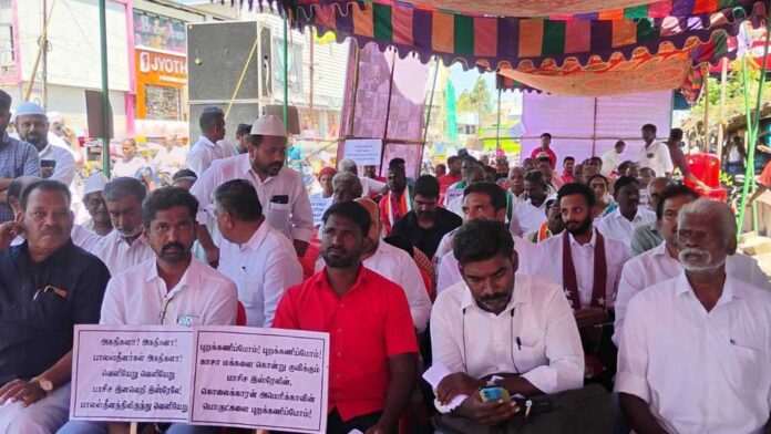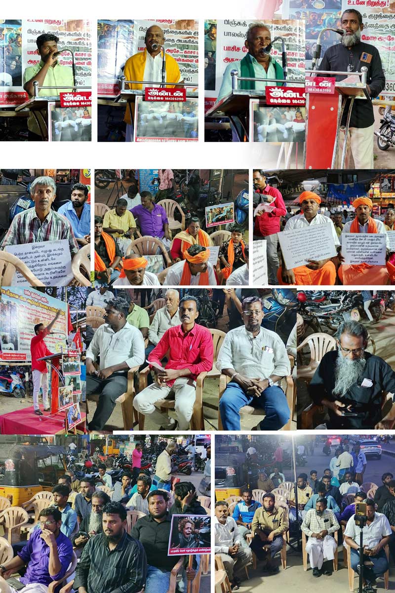 ஆதித் தமிழர் பேரவை கட்சி, MPM ட்ரஸ்ட், அய்யாவழி உள்ளிட்ட பல்வேறு கட்சிகள், அமைப்புகளைச் சேர்ந்த தோழர்கள், ஜனநாயக சக்திகள் கலந்துகொண்ட இந்த ஆர்ப்பாட்டத்தில் தோழர் கின்ஷன் கண்டன முழக்கங்களை எழுப்ப, ஜனநாயக சக்திகள் முழக்கமிட்டனர். சுற்றியிருந்த பொதுமக்கள் ஆர்ப்பாட்டத்தில் எழுப்பப்பட்ட கண்டன உரைகளை உன்னிப்பாக கவனித்து ஆதரவளித்தனர்.