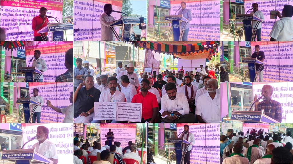நெல்லை மாவட்ட மக்கள் அதிகாரக் கழகம் மற்றும் சமூக ஆர்வலர்கள் கூட்டமைப்பு இணைந்து “பாசிச இஸ்ரேல் அரசே, காசா மீதான இன அழிப்புப் போரை உடனே நிறுத்து!” என்கிற தலைப்பில் அக்டோபர் 4 அன்று நெல்லை மேலப்பாளையம் பகுதியில் ஆர்ப்பாட்டம் நடத்தப்பட்டது.