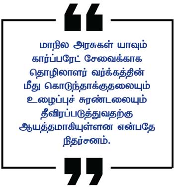 ஒருபுறம், மறுகாலனியாக்கக் கொள்கைகளை தீவிரமாக நடைமுறைப்படுத்திவரும் மோடி கும்பல் தொழிலாளர்கள் மீதான தாக்குதலை தீவிரப்படுத்தி வருகிறது. மறுபுறம், பா.ஜ.க-வை எதிர்ப்பதாக சொல்லிக்கொள்ளும் எதிர்க்கட்சிகளும் தாங்கள் ஆளும் மாநிலங்களில் தொழிலாளர்கள் மீதான சுரண்டலைத் தீவிரப்படுத்தும் விதமாக சட்டத்திட்டங்களை நடைமுறைப்படுத்தி வருகின்றன. மேலும், பாசிச மோடி அரசு கொண்டுவந்துள்ள புதிய நான்கு தொழிலாளர் சட்டங்களை நடைமுறைக்குக் கொண்டுவருவதற்கு, எதிர்க்கட்சிகள் ஆளும் மாநிலங்கள் உட்பட 25 மாநிலங்கள் மற்றும் எட்டு யூனியன் பிரதேசங்கள் ஒப்புக்கொண்டு அதற்கான வரைவு விதிகளை வகுத்துள்ளன.