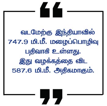 அதேசமயம், வடமேற்கு இந்தியாவில் 747.9 மி.மீ. மழைப்பொழிவு பதிவாகி உள்ளது. இது வழக்கத்தை விட 587.6 மி.மீ. அதிகமாகும். குறிப்பாக பஞ்சாப், உத்தராகண்ட், காஷ்மீர், இமாச்சலப் பிரதேசம் ஆகிய மாநிலங்களில் இந்த பருவக் காலத்தில் பெருமழையும் பெருவெள்ளமும் ஏற்பட்டது.