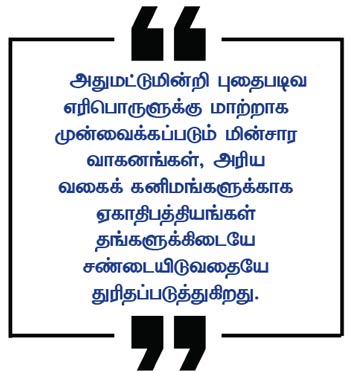 அதுமட்டுமின்றி புதைபடிவ எரிபொருளுக்கு மாற்றாக முன்வைக்கப்படும் மின்சார வாகனங்கள், அரிய வகைக் கனிமங்களுக்காக ஏகாதிபத்தியங்கள் தங்களுக்கிடையே சண்டையிடுவதையே துரிதப்படுத்துகிறது. இவை ஒருபுறம் போரையும் மறுபுறம் காடுகள் அழிவை நோக்கியுமே இட்டுச் செல்லும். இது மேலும் புவிக்கோளத்தின் இருப்பை கேள்விக்குள்ளாகும். எனவே முதலாளித்துவக் கண்ணோட்டத்தில், அதாவது லாப நோக்கில் முன்வைக்கப்படும் தீர்வுகள் சமூகத்தையும் பூமியையும் மேலும் மேலும் மீள முடியாத புதை குழிக்குள்ளே இட்டுச் செல்லும்.