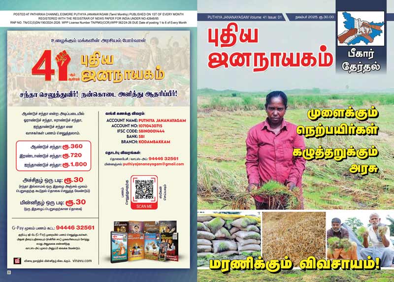 புதிய ஜனநாயகம் – ஆகஸ்ட் 2025 இதழின் அச்சுப் பிரதியைப் பெற கீழே குறிப்பிடப்பட்டுள்ள தொலைபேசி எண்ணைத் தொடர்பு கொள்ளவும்.