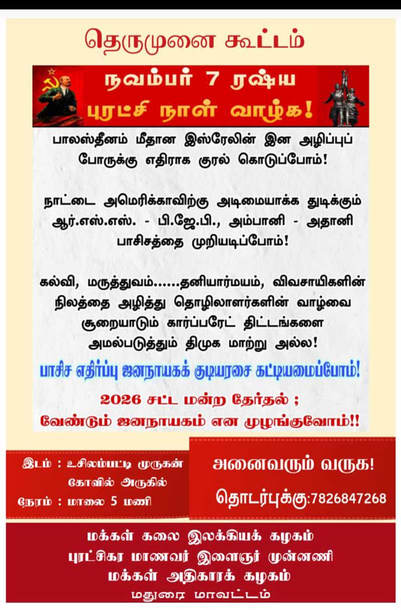 உழைக்கும் வர்க்கம் அதிகாரத்தை கைப்பற்றிய இரசிய புரட்சி நாளை உயர்த்தி பிடித்து, கொடியேற்றும் நிகழ்வு மற்றும் கிருஷ்ணகிரி பேருந்து நிலையத்தில் மக்களிடம் புரட்சியின் சாதனைகளை விளக்கி இனிப்பு வழங்கவுள்ளோம்.