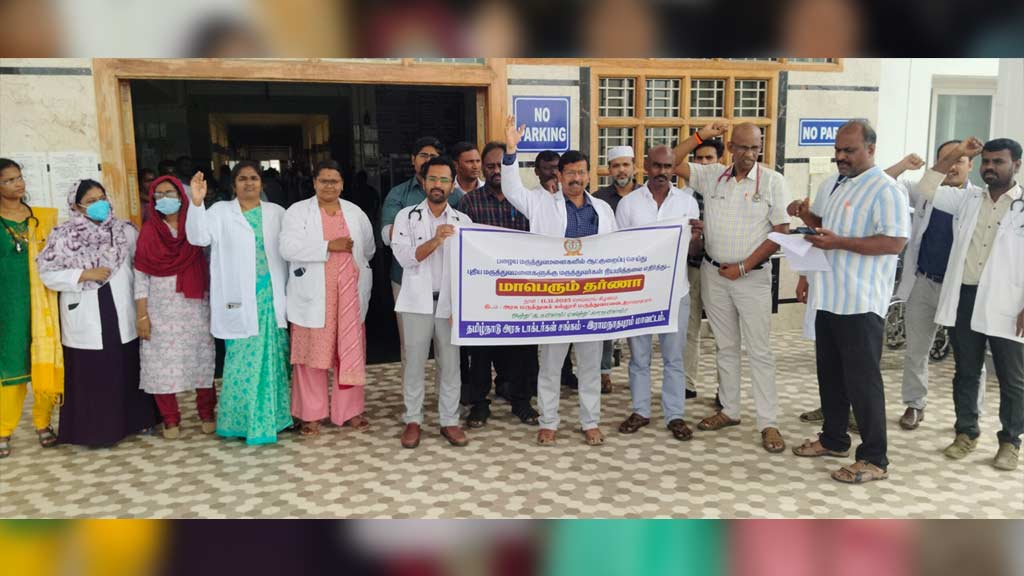 இந்த ஆட்குறைப்பு நடவடிக்கையைக் கண்டித்து, நேற்று (நவம்பர் 11) தமிழ்நாடு அரசு மருத்துவர்கள் சங்கம் (Tamil Nadu Government Doctors Association – TNGDA) சார்பில் கிருஷ்ணகிரி, இராமநாதபுரம், திருவாரூர், கரூர், நாமக்கல், நீலகிரி உள்ளிட்ட 14 இடங்களிலும், அரசு மருத்துவர்கள் சங்கங்களின் கூட்டமைப்பு (Federation of Government Doctors Associations – FOGDA) சார்பில் சென்னை கீழ்ப்பாக்கம் அரசு மருத்துவ கல்லூரி மருத்துவமனை வளாகத்திலும் மருத்துவர்கள் தர்ணா போராட்டம் நடத்தினர்.