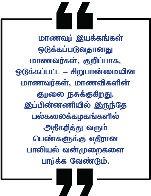இவ்வாறு மாணவர் இயக்கங்கள் ஒடுக்கப்படுவதானது மாணவர்கள், குறிப்பாக, ஒடுக்கப்பட்ட – சிறுபான்மையின மாணவர்கள், மாணவிகளின் குரலை நசுக்குகிறது. இப்பின்னணியில் இருந்தே பல்கலைக்கழகங்களில் அதிகரித்து வரும் பெண்களுக்கு எதிரான பாலியல் வன்முறைகளையும், தலித் பிற்படுத்தப்பட்ட மற்றும் சிறுபான்மை மாணவர்களின் மீதான ஒடுக்குமுறைகளையும் வேறுபடுத்திப் பார்க்க வேண்டும். நீதிக்கோரி போராடும் மாணவர்கள் கல்வி நிலைய வளாகத்திற்குள்ளாகவே போலீசால் கொடூரமாகத் தாக்கப்படுவதையும் இந்த அடிப்படையில் பரிசீலிக்க வேண்டும்.