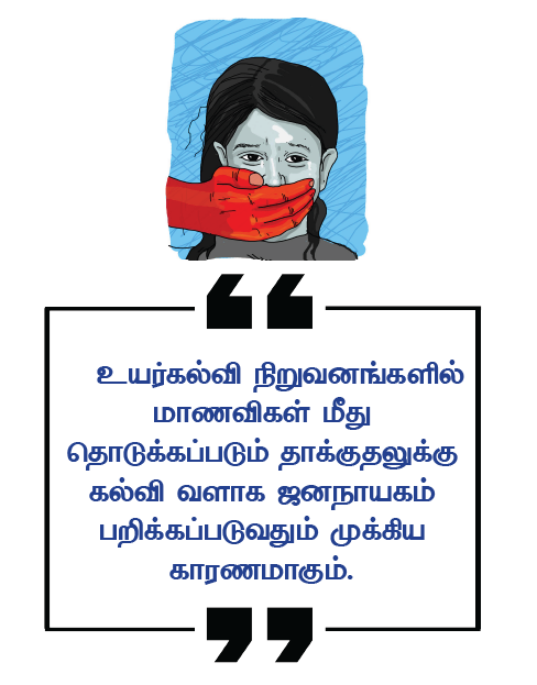 இவ்வாறு கல்லூரி – பல்கலைக்கழகங்களில் மாணவிகள் மீதான பாலியல் வன்முறைகள் அதிகரித்து வருவதை தனித்த நிகழ்வாக பார்க்க முடியாது. பார்ப்பனிய ஆணாதிக்கம், ஆபாச வெறியூட்டும் மறுகாலனியாக்க நுகர்வுவெறி, போதைக் கலாச்சாரம் ஆகியவை பெண்கள் மீதான பாலியல் வன்முறைகளுக்கு அடிப்படை காரணங்களாக இருந்தாலும், உயர்கல்வி நிறுவனங்களில் மாணவிகள் மீது தொடுக்கப்படும் தாக்குதலுக்கு கல்வி வளாக ஜனநாயகம் பறிக்கப்படுவதும் முக்கிய காரணமாகும்.