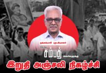 தனது இளமைக்காலம் முதல் கடந்த 50 ஆண்டுகளாக புரட்சிகர அரசியலுக்கு தன்னை அர்ப்பணித்துக் கொண்ட தோழர் சம்பத் அவர்களுக்கு “புதிய ஜனநாயகம்” ஆசிரியர் குழு சார்பாக சிவப்பஞ்சலியைச் செலுத்துகிறோம்.