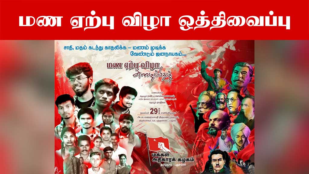 சாதி, மதம் கடந்து காதலிக்க – மணம் முடிக்க வேண்டும் ஜனநாயகம் என்ற முழக்கத்தோடு, நவம்பர் 29ஆம் தேதி நடக்க இருந்த தோழர் ரவி (எ) செல்வகணேஷ், தோழர் ராதிகா மண ஏற்பு விழா ஒத்தி வைக்கப்படுகிறது. நக்சல்பாரி புரட்சியாளர் தோழர் சம்பத் கடந்த நவம்பர் 17 ஆம் தேதி உயிரிழந்தார். அமைப்பின் முதுபெரும் தோழர் இறந்துவிட்ட காரணத்தினால் மண ஏற்பு விழாவினை ஒத்தி வைக்கிறோம். திருமணம் நடத்துவதற்கான குறிப்பான தேதியை விரைவில் அறிவிக்கிறோம்.