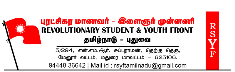 மாணவர் பிரச்சினைக்காகக் குரல் கொடுக்கும் மாணவர் அமைப்புகள், தோழர்கள் மீது தாக்குதல் தொடுக்கும் தி.மு.க. அரசு, தமிழ்நாடு போலீசின் இந்நடவடிக்கையை புரட்சிகர மாணவர் – இளைஞர் முன்னணி கண்டிக்கிறது. புரட்சிகர – ஜனநாயக சக்திகள், சக மாணவர் அமைப்புகள் இந்நடவடிக்கையைக் கண்டித்து குரல் எழுப்ப வேண்டுமென்றும் கேட்டுக்கொள்கிறது.