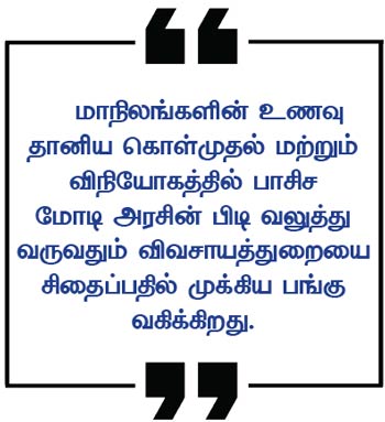 மறுபுறம், மாநிலங்களின் உணவு தானிய கொள்முதல் மற்றும் விநியோகத்தில் பாசிச மோடி அரசின் பிடி வலுத்து வருவதும் விவசாயத்துறையை சிதைப்பதில் முக்கிய பங்கு வகிக்கிறது. கொள்முதல் செய்யப்படும் நெல்லின் ஈரப்பதம் முதல் பொது விநியோகத்திற்கான அரிசியில் செறிவூட்டப்பட்ட அரிசியை (இதனை உட்கொள்வோருக்கு உடல் ரீதியான பாதிப்புகள் ஏற்படும் என்பது குறிப்பிடத்தக்கது) கலக்கும் விகிதம் வரை அனைத்தையும் தீர்மானிக்கும் அதிகாரம் ஒன்றிய அரசுக்கே உள்ளதால், மாநில அரசுகள் அதனை சார்ந்தே உள்ளன.
