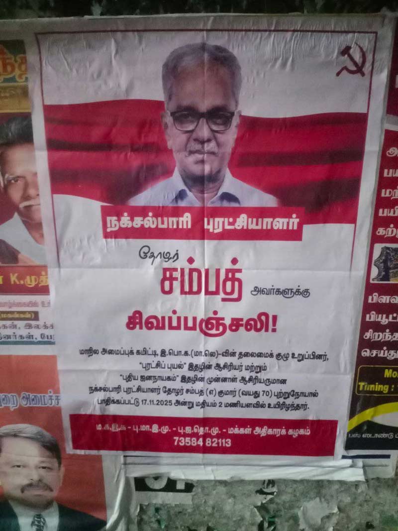 மாநில அமைப்புக் கமிட்டி, இ.பொ.க.(மா.லெ)-வின் தலைமைக்குழு உறுப்பினரும் புதிய ஜனநாயகத்தின் முன்னாள் ஆசிரியருமான தோழர் சம்பத் புற்றுநோயால் பாதிக்கப்பட்டு கடந்த நவம்பர் 17-ஆம் தேதி சென்னையில் உயிரிழந்தார். தனது வாழ்நாளில் 50 ஆண்டு காலத்தை புரட்சிகர அரசியலுக்கு அர்ப்பணித்துக் கொண்ட தோழர் சம்பத், கட்சி, தோழர்கள், அரசியல், அமைப்புப் பணிகள் என்றே தன் வாழ்நாளை செலவிட்டார்.