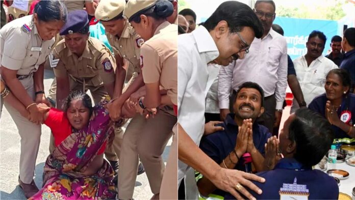 மேலும் தூய்மைப் பணிகளை தனியாருக்குத் தாரை வார்க்கும் நடவடிக்கையை எதிர்த்தும், தமது உரிமைகளுக்காகவும் தூத்துக்குடி உள்ளிட்ட அனைத்து பகுதிகளிலும் தூய்மைப் பணியாளர்கள் தொடர்ச்சியாகப் போராடி வருகின்றனர். தொழிலாளர்களின் உரிமைகளைக் காலில் போட்டு மிதித்துக் கொண்டே வாயில் உணவு தருகிறேன் என்பது தி.மு.க அரசின் அருவருக்கத்தக்க செயலாகும்.