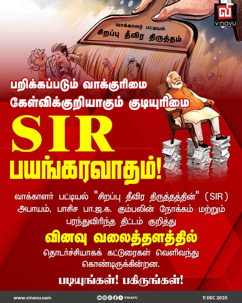 வாக்காளர் பட்டியல் “சிறப்பு தீவிர திருத்தத்தின்” (SIR) அபாயம், பாசிச பா.ஜ.க. கும்பலின் நோக்கம் மற்றும் பரந்துவிரிந்த திட்டம் குறித்து வினவு வலைத்தளத்தில் தொடர்ச்சியாகக் கட்டுரைகள் வெளிவந்து கொண்டிருக்கின்றன.