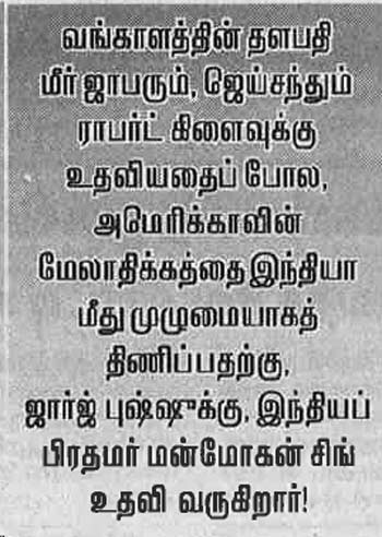 வங்காளத்தின் தளபதி மீர்ஜாபரும், ஜெய்சந்தும் ராபர்ட் கிளைவுக்கு உதவியதைப் போல, அமெரிக்காவின் மேலாதிக்கத்தை இந்தியா மீது முழுமையாகத் திணிப்பதற்கு, ஜார்ஜ் புஷ்ஷுக்கு, இந்தியப் பிரதமர் மன்மோகன் சிங் உதவி வருகிறார்!