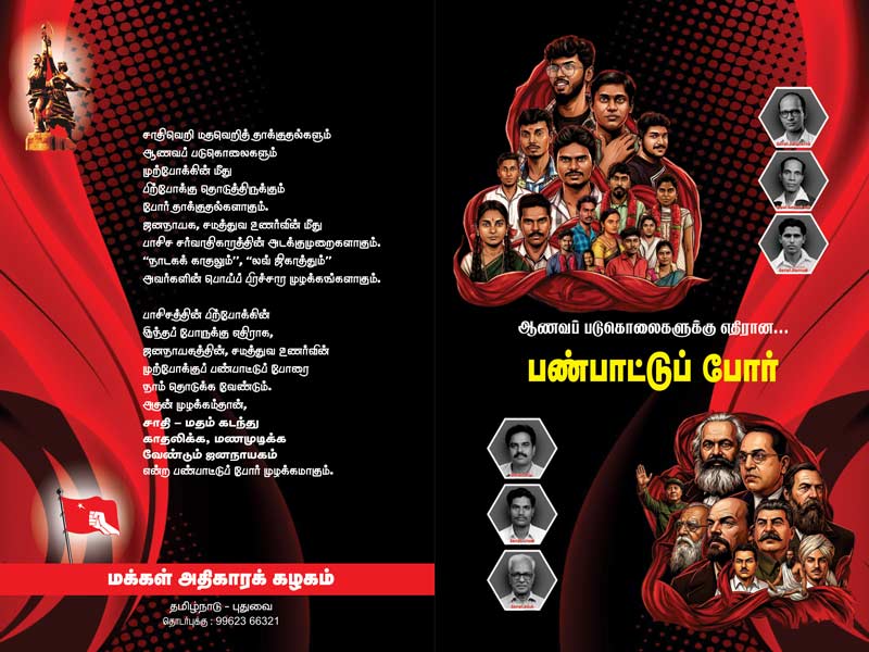 தமிழ்நாட்டில் தலித் மக்கள் மீதான சாதி வெறியாட்டங்கள் நாள்தோறும் அதிகரித்து வருகின்றன. இச்சூழலில், “சாதி – மதம் கடந்து காதலிக்க மணமுடிக்க வேண்டும் ஜனநாயகம்..” என்ற முழக்கத்தின் கீழ் தோழர்கள் ராதிகா – ரவி ஆகியோரின் சாதி மறுப்பு புரட்சிகர மணவிழா மக்கள் அதிகாரக் கழகம் சார்பாக நடைபெற உள்ளது. தோழர்களின் இந்த சாதி மறுப்பு மணவிழா ஆணவப் படுகொலைகளுக்கு எதிராக மாற்றுப் பண்பாட்டை முன்னிறுத்தும் வகையில் நடைபெற உள்ளது. இம்மணவிழாவில் புதிய ஜனநாயகம் பதிப்பகம் சார்பாக “தலித் மக்கள் மீது அதிகரித்து வரும் வன்முறைகள்: என்ன செய்யப் போகிறோம்?” என்ற நூலும், மக்கள் அதிகாரக் கழகம் சார்பாக “ஆணவப் படுகொலைகளுக்கு எதிரான… பண்பாட்டுப் போர்” மற்றும் “சாதி ஒழிப்புப் போராளி இமானுவேல் சேகரன்”ஆகிய நூல்களும் வெளியிடப்பட உள்ளன. மதுரையில் டிசம்பர் 28 அன்று காலையில் நடைபெற உள்ள இம்மணவிழாவில் வாசகர்கள் கலந்துகொள்ளுமாறும் இந்நூல்களை வாங்கிப் படித்து மக்களிடம் பரவலாகக் கொண்டு செல்லுமாறும் கேட்டுக்கொள்கிறோம்.