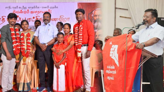 அத்தகைய புரிதலோடு நாம் இந்த களத்தில் கைகோர்த்து நிற்போம். அதைத்தான் இன்றைக்கு மணமக்கள் இருவரும் உறுதிமொழியாக ஏற்றுக்கொண்டார்கள். பார்ப்பனிய – முதலாளித்துவ பண்பாடுகளை நிராகரித்து, ஜனநாயகப் பண்பாட்டுக் கூறுகளை ஏற்று இல்லறத்தை நாங்கள் நல்லறமாக நடத்துகிறோம் என்று உறுதிமொழி ஏற்றார்கள். நாம் ஒவ்வொருவரும் அப்படி உறுதிமொழி ஏற்க கடமைப்பட்டவர்களாக இருக்கிறோம், களமாட கடமைப்பட்டவர்களாக இருக்கிறோம். இடதுசாரி அரசியல் இம்மண்ணில் செழுமைப்பெற வேண்டும் என்கிற புரிதலோடு கைகோர்த்து நிற்போம் என்பதைச் சொல்லி மணமக்கள் எல்லா வளமும் நலமும் பெற்று வாழ்வாங்கு வாழ்க என்று வாழ்த்தி விடைபெறுகிறேன். நன்றி வணக்கம்!
