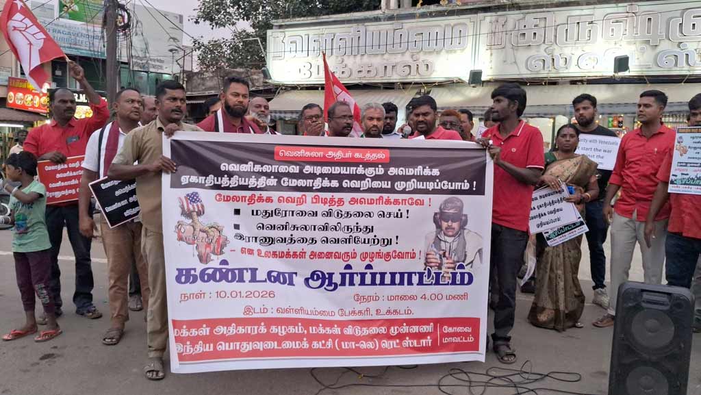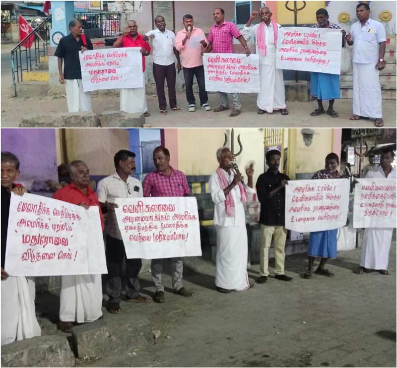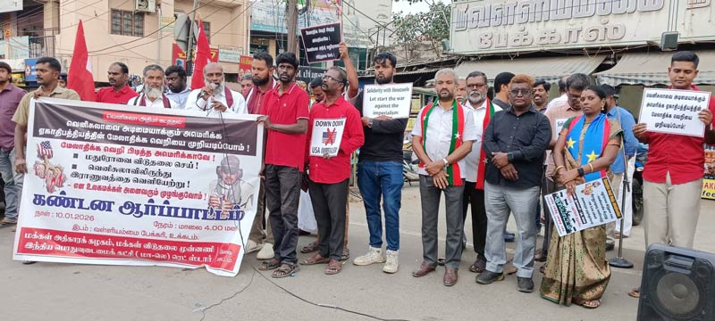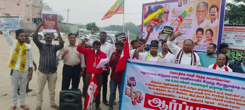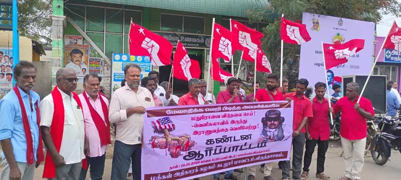 அமெரிக்க மேலாதிக்க வெறியை முறியடிப்போம்! வெனிசுலா அதிபர் மதுரோவை உடனே விடுதலை செய்! வெனிசுலாவில் இருந்து அமெரிக்கப் படையை வாபஸ் வாங்கு என்ற முழக்கங்களுடனும் வெனிசுலா அதிபர் அமெரிக்காவால் கடத்தப்பட்டதற்கு மௌனம் காக்கும் இந்திய பிரதமர் மோடியை கண்டித்தும், மதுரை மாவட்டம் உசிலம்பட்டியில் 10.1.2026 அன்று ஆர்ப்பாட்டம் நடைபெற்றது. இதில் மக்கள் அதிகாரக் கழகம், வி.சி.க, 58 கிராம் கால்வாய் சங்கம், சி.பி.எம், மே 17 இயக்க தோழர்கள் கலந்து கொண்டனர்.