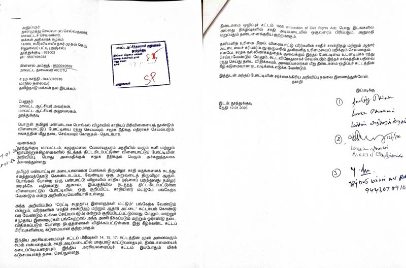 பொது அமைதிக்கும் சமூக நல்லிணக்கத்திற்கும் வேட்டு வைக்கும் இத்தகைய தீண்டாமைச் செயல்களை எக்காலத்திலும் அனுமதிக்க முடியாது. இது தொடர்பாக, ஜனவரி 12 அன்று மக்கள் அதிகாரக் கழகம் மாவட்டச் செயலாளர் தோழர் தாளமுத்து செல்வா, AICCTU தூத்துக்குடி மாவட்டத் தலைவர் தோழர் மின்னல் அம்ஜத் மற்றும் தமிழ்நாடு மக்கள் நல இயக்கம் மாநில தலைவர் தோழர் ச.மு. காந்தி ஆகியோர் தூத்துக்குடி மாவட்ட ஆட்சியரை நேரில் சந்தித்து உரிய நடவடிக்கை எடுக்கக் கோரி மனு அளித்தனர்.