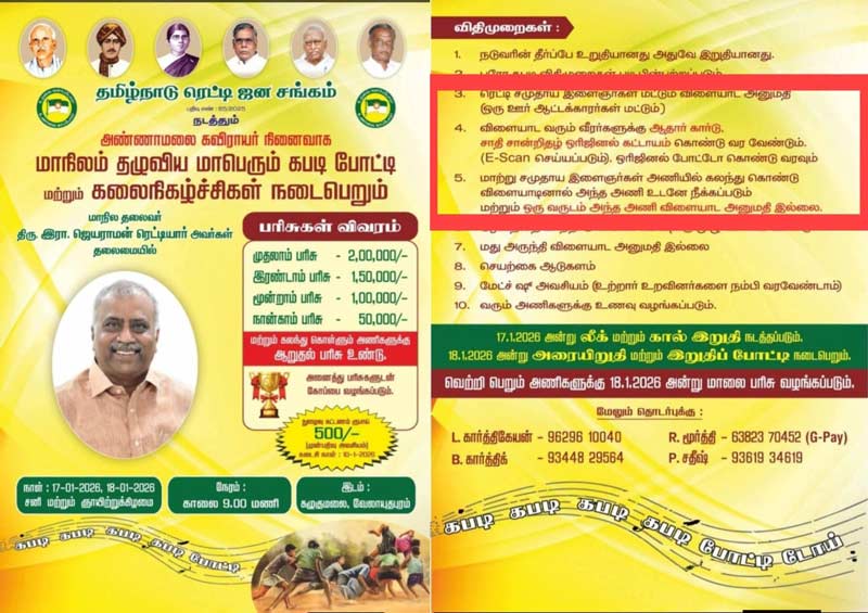 சமத்துவத்தின் அடையாளமான பொங்கல் திருவிழாவை சாதிய நஞ்சாக மாற்றும் வகையில், இந்தப் போட்டியில் “ரெட்டி சமுதாய இளைஞர்கள் மட்டுமே” பங்கேற்க வேண்டும் என்றும், வீரர்களின் சாதிச் சான்றிதழைப் பெற்று ‘இ-ஸ்கேன்’ (E-Scan) செய்து சரிபார்ப்போம் என்றும் அந்தச் சங்கம் அறிவித்துள்ளது. மாற்றுச் சமுதாய இளைஞர்கள் பங்கேற்றால் அந்த அணிக்கு ஓராண்டு தடை விதிக்கப்படும் என்ற இவர்களது அறிவிப்பு, இந்திய அரசியலமைப்புச் சட்டத்தின் அடிப்படையை மீறுவதாகும். இது அரசியலமைப்புச் சட்டப் பிரிவுகள் 14, 15, 17 மற்றும் 1955-ஆம் ஆண்டு தீண்டாமை ஒழிப்புச் சட்டத்தின் கீழ் தண்டனைக்குரிய பெருங்குற்றமாகும்.