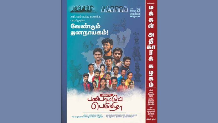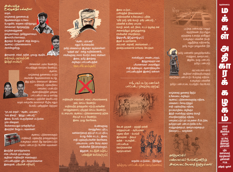 - சாதி, மத மறுப்பு மணங்களை மக்கள் முன்னிலையில் அரசே முன்னின்று நடத்தி அங்கீகரி! சாதி, மத மறுப்பு மணம் புரியும் இணையர்களுக்கு உரிய பாதுகாப்பு வழங்கு! ஊக்கத்தொகை வழங்கு! சாதிவாரிக் கணக்கெடுப்பை நடத்து! மக்கள்தொகைக் கணக்கெடுப்பில் “சாதி, மதமற்றவர்” என்று பதிவு செய்ய தனிப்பிரிவை உருவாக்கு! “சாதி, மதமற்றோர்” என சான்றிதழ் பெற்றவர்களுக்கும் இட ஒதுக்கீடு வழங்கு!