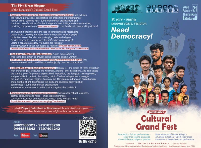 - Declare Madurai as Tamil Cultural Zone! Madurai is – the cradle of Tamil civilization with archaeological treasures like Keezhadi, ancient Tamil inscriptions, and Jain caves; the starting point for protests against Hindi imposition, the Tungsten mining project, and pro-Jallikattu protest; the starting point of Indian Independence struggle; the land of symbols of religious harmony like Thiruparankundram and Parambumalai and a symbol of anti-Brahminical folk deity and ancestral deity worship! Ban the RSS – BJP Sangh Parivar organizations and dominant caste-fanatic outfits that act against this tradition!