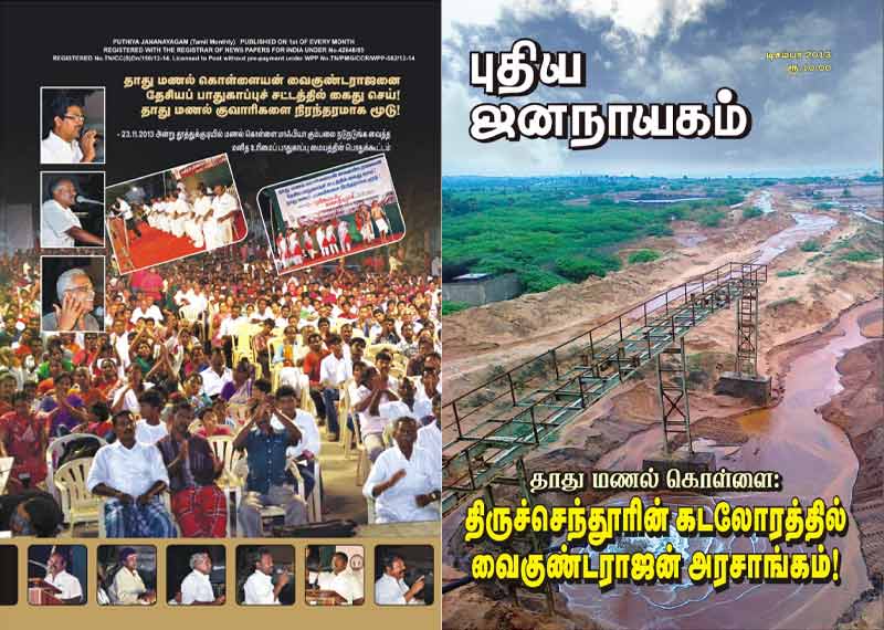 - தாது மணல் கொள்ளையன் வைகுண்டராஜனை தேசியப் பாதுகாப்புச் சட்டத்தில் கைது செய்! தாது மணல் குவாரிகளை நிரந்தரமாக மூடு– 23.11.2013 அன்று தூத்துக்குடியில் மணல் கொள்ளை மாஃபியா கும்பலை நடுநடுங்க வைத்த மனித உரிமை பாதுகாப்பு மையத்தின் பொதுக்கூட்டம்.