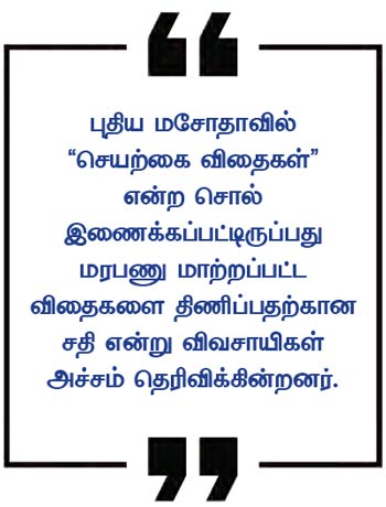 மேலும், புதிய மசோதாவில் “செயற்கை விதைகள்” என்ற சொல் இணைக்கப்பட்டிருப்பது மரபணு மாற்றப்பட்ட விதைகளை திணிப்பதற்கான சதி என்று விவசாயிகள் அச்சம் தெரிவிக்கின்றனர்.