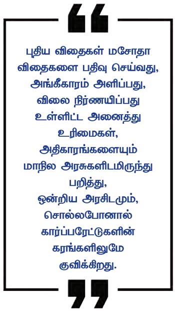 இந்த புதிய விதை மசோதா விதைகளை பதிவு செய்வது, அங்கீகாரம் அளிப்பது, விலை நிர்ணயிப்பது உள்ளிட்ட அனைத்து உரிமைள், அதிகாரங்களையும் மாநில அரசுகளிடமிருந்து பறித்து, ஒன்றிய அரசிடமும், சொல்லபோனால் கார்ப்பரேட்டுகளின் கரங்களிலுமே குவிக்கிறது.