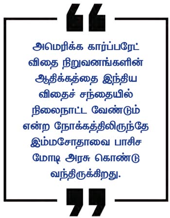 குறிப்பாக, அமெரிக்க கார்ப்பரேட் விதை நிறுவனங்களின் ஆதிக்கத்தை இந்திய விதைச் சந்தையில் நிலைநாட்ட வேண்டும் என்ற நோக்கத்திலிருந்தே இம்மசோதாவை பாசிச மோடி அரசு கொண்டு வந்திருக்கிறது.