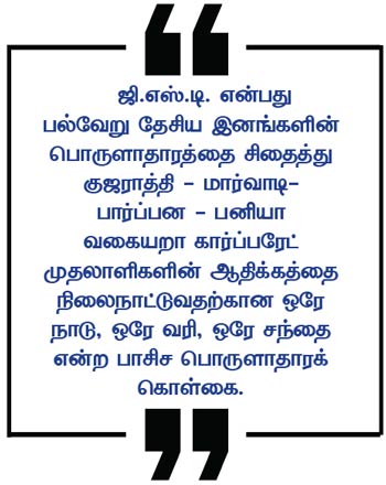 ஜி.எஸ்.டி. என்பது மூன்று குற்றவியல் சட்டங்கள், வாக்காளர் பட்டியல் சிறப்பு தீவிர மறு ஆய்வு, தொகுதி மறுவரையறை போன்று இந்துராஷ்டிர அடிக்கட்டுமானங்களில் ஒன்றாகும். இதன் மூலம் நாட்டின் வரி வசூலிக்கும் கட்டமைப்பையே மோடி அரசானது இந்துராஷ்டிரத்திற்கேற்ப, அம்பானி-அதானிகளின் பொருளாதார ஆதிக்கத்தை நிறுவுவதற்கேற்ப மறுவார்ப்பு செய்து கொண்டிருக்கிறது.