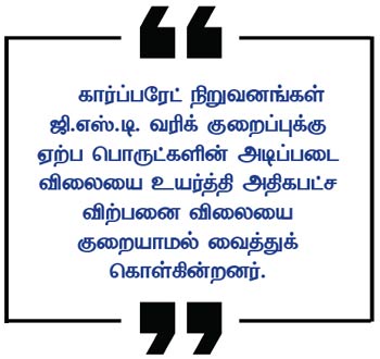 ஆனால், கார்ப்பரேட் நிறுவனங்கள் ஜி.எஸ்.டி. வரிக் குறைப்புக்கு ஏற்ப பொருட்களின் அடிப்படை விலையை உயர்த்தி அதிகபட்ச விற்பனை விலையை குறையாமல் வைத்துக் கொள்கின்றனர். மேலும், ஜி.எஸ்.டி. வரிக் குறைப்பிற்கேற்ப பொருட்களின் எடையை அதிகரிப்பது போன்ற நடவடிக்கைகளின் மூலம் ஜி.எஸ்.டி. வரிக் குறைப்பின் சிறு பலன்களையும் கார்ப்பரேட் நிறுவனங்களே அபகரித்துக் கொள்வதற்கான வாய்ப்புகளே உள்ளன.