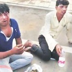 தாக்குதலுக்கு உள்ளாகி முகம் வீங்கிய நிலையில் இருவர் தரையில் அமர்த்தப்பட்டிருக்கின்றனர். அவர்களுக்கு முன்னால் உள்ள பையில் சாணி வைக்கப்பட்டிருக்கிறது. அருகிலேயே தண்ணீரும் வைக்கப்பட்டிருக்கிறது.