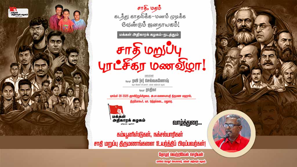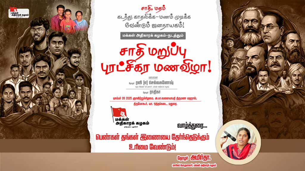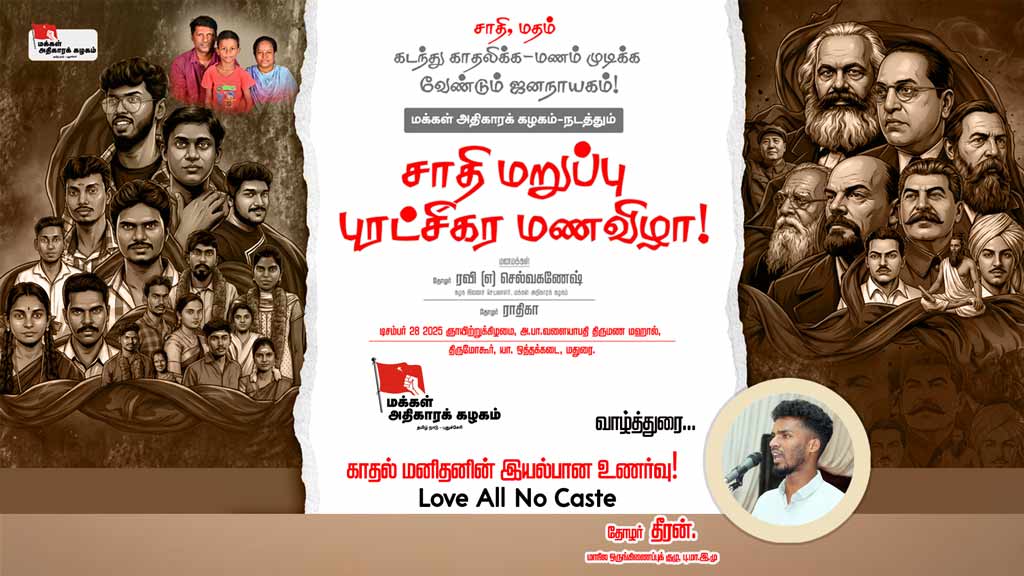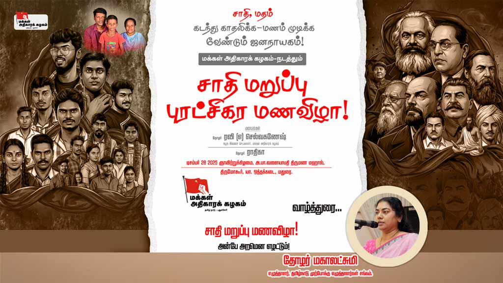 சாதி மறுப்பு மணவிழா: அன்பே அறமென எழட்டும்! தோழர் மகாலட்சுமி | வாழ்த்துரை காணொளியைப் பாருங்கள்! பகிருங்கள்!! சமூக வலைத்தளங்களில் வினவை பின்தொடருங்கள்: WhatsApp, X (Twitter), Facebook, YouTube, Telegram, Instagram -